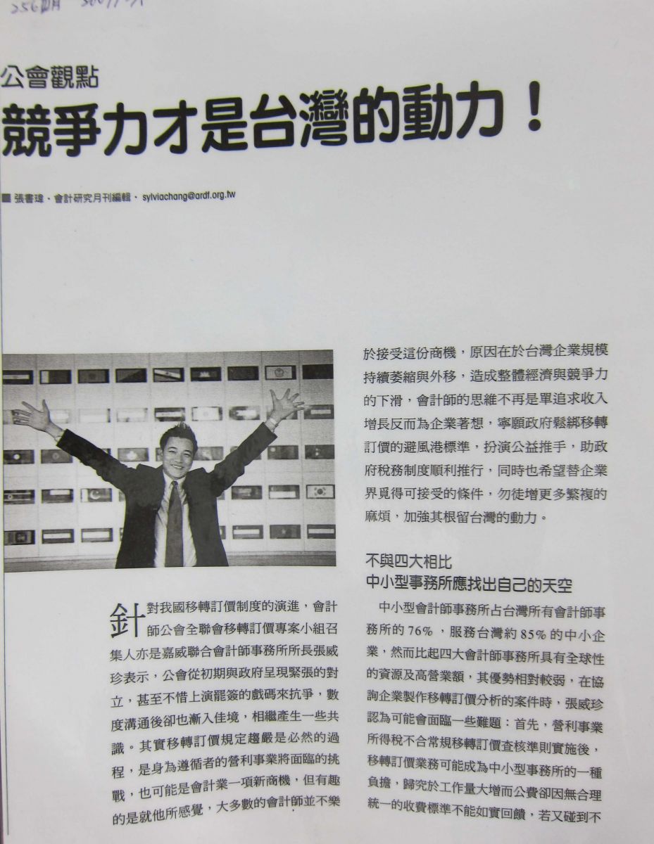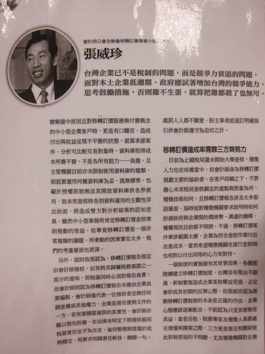 針對我國移轉訂價制度的演進,會計師公會全聯會移轉訂價專案小組召集人亦是嘉威聯合會計師事務所所長張威珍表示,公會從初期與政府呈現緊張的對立,甚至不惜上演罷簽的戲碼來抗爭,數度溝通後卻也漸入佳境,相繼產生一些共識。其實移轉訂價規定趨嚴是必然的過程,是身為遵循者的營利事業將面臨的挑戰,也可能是會計業一項新商機,但有趣的是就他所感覺,大多數的會計師並不樂於接受這份商機,原因在於台灣企業規模持續萎縮與外移,造成整體經濟與競爭力的下滑,會計師的思維不再是單追求收入增長反而為企業著想,寧願政府鬆綁移轉訂價的避風港標準,扮演公益推手,助政府稅務制度順利推行,同時也希望替企業界覓得可接受的條件,勿徒增更多繁複的麻煩,加強其根留台灣的動力。