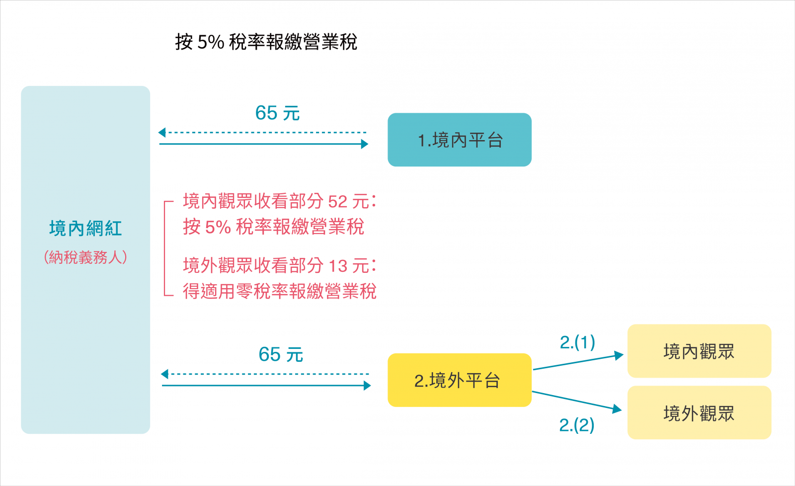 以下圖舉例說明,境內網紅甲提供表演勞務授權境外平臺YouTube使用、收益,自YouTube取得分潤性質勞務收入65元,其中源自境內付費或免付費觀眾收看部分占80%(即52元),因網紅甲表演勞務提供地、表演收看及使用地均在境內,由甲按稅率5%報繳營業稅;至源自境外付費或免付費觀眾收看部分占20%(即13元),因網紅甲表演勞務提供地在境內、表演收看及使用地在境外,甲得適用零稅率報繳營業稅。