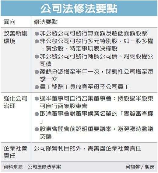 知情官員表示,改善創業環境是這次修法的一大重點,具體而言,在非公發企業的籌資管道,突破目前只能發行有面額股的限制,新增超低面額股、無面額股的選項,讓新創企業既能引進金主,又可保留主導權,解決新創業者「要錢就失去經營權」的困境。