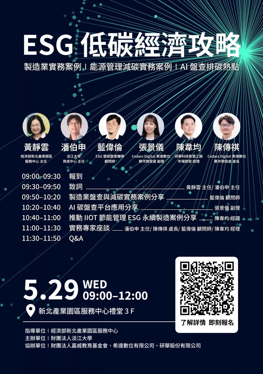 為協助新北產業園區內企業提升營運效能、降低成本,增強ESG與碳管理能力,嘉威教育基金會、淡江大學、希達數位、研華將攜手推動低碳經濟攻略,提供寶貴的實戰經驗給大家!