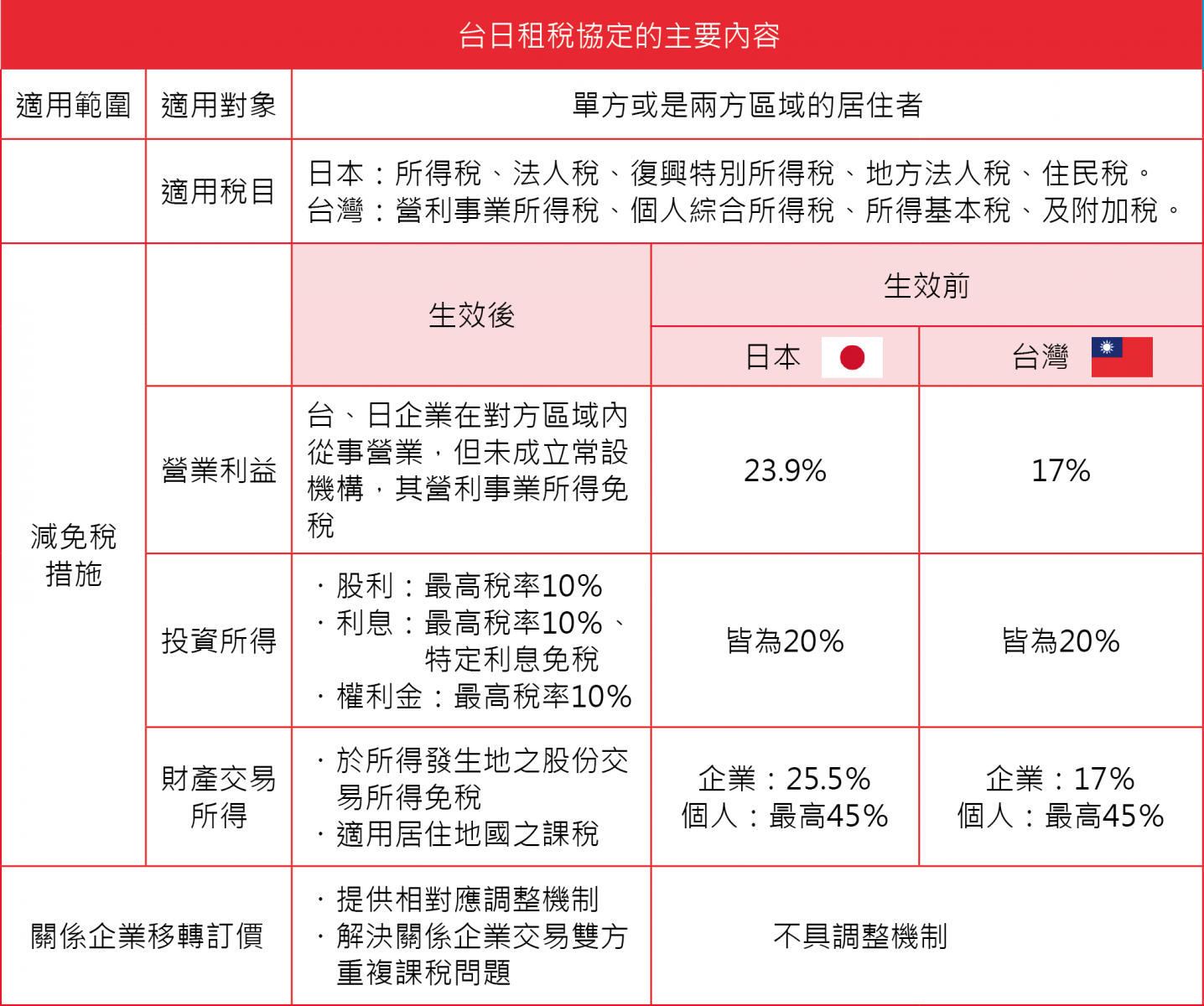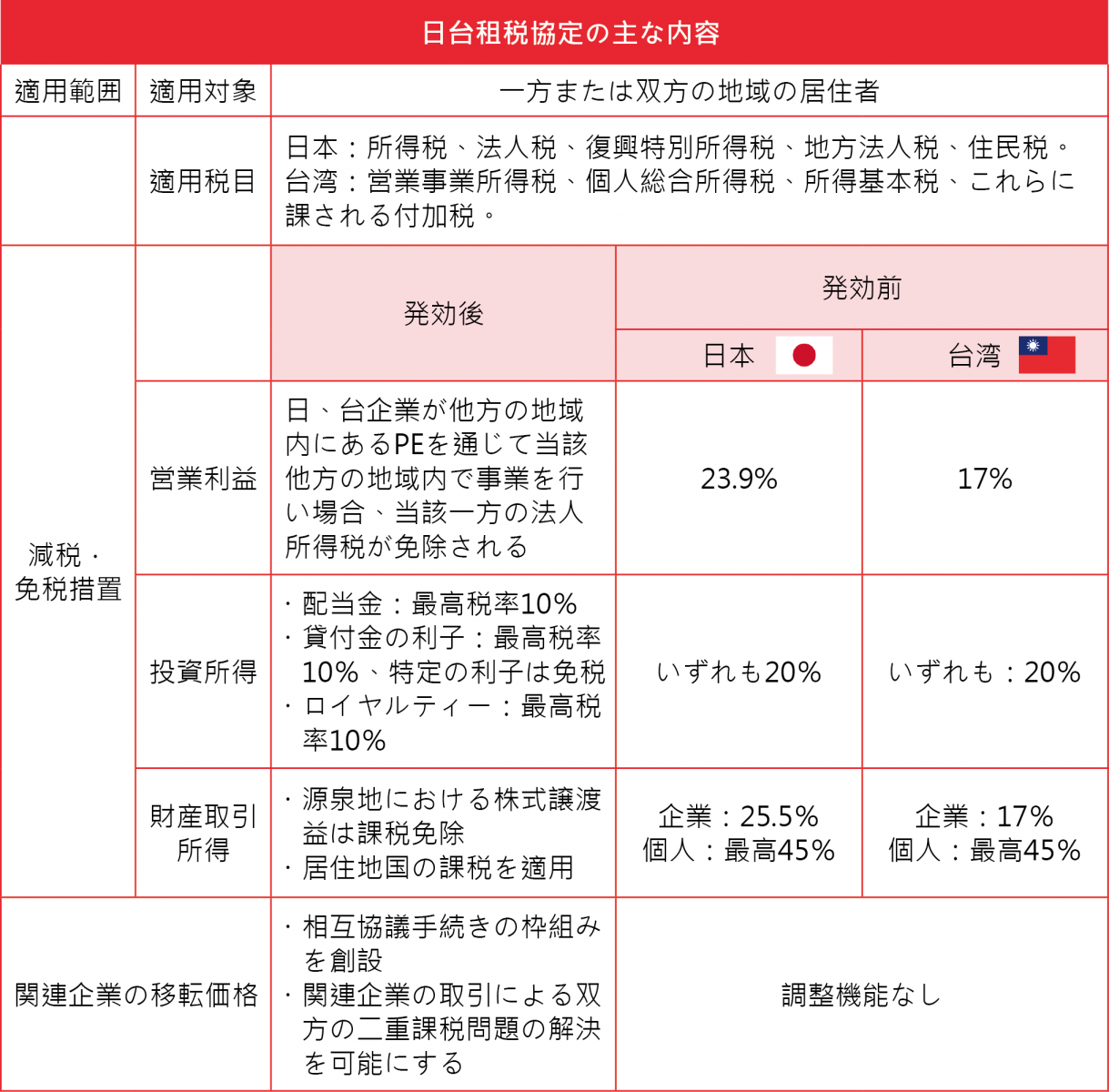 根據台日租稅協定,日本與台灣雙方的個人及企業之各種所得,適用於所得發生地的所得稅減稅與免稅措施,解除雙重課稅,藉以減輕稅負。
